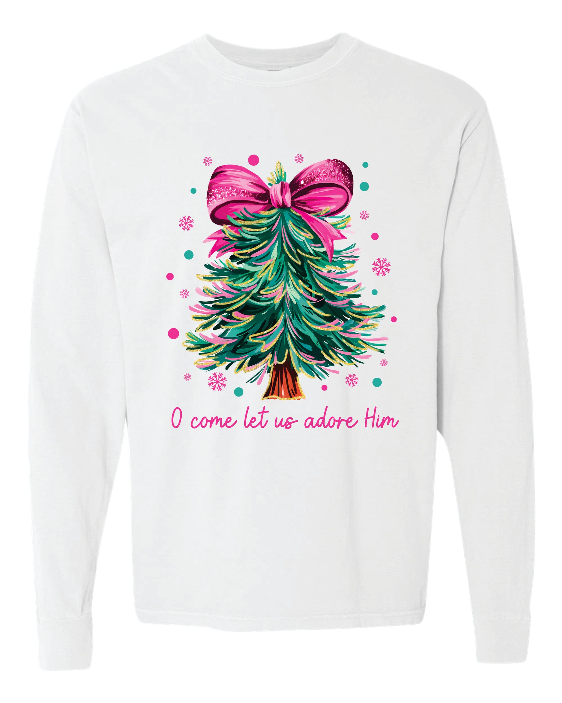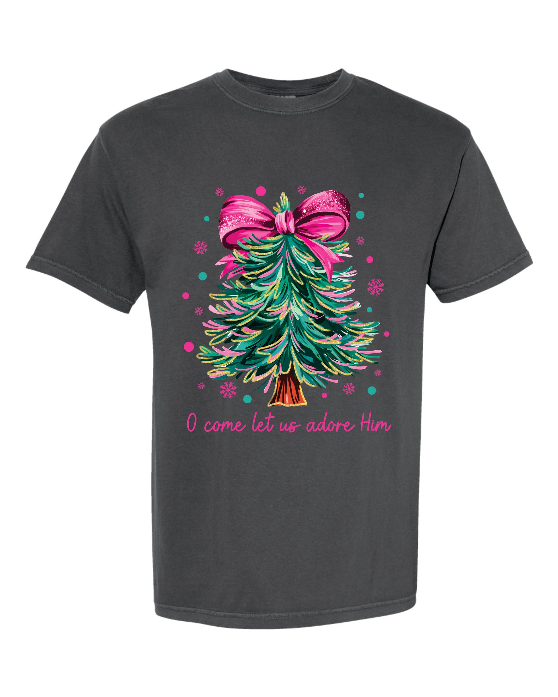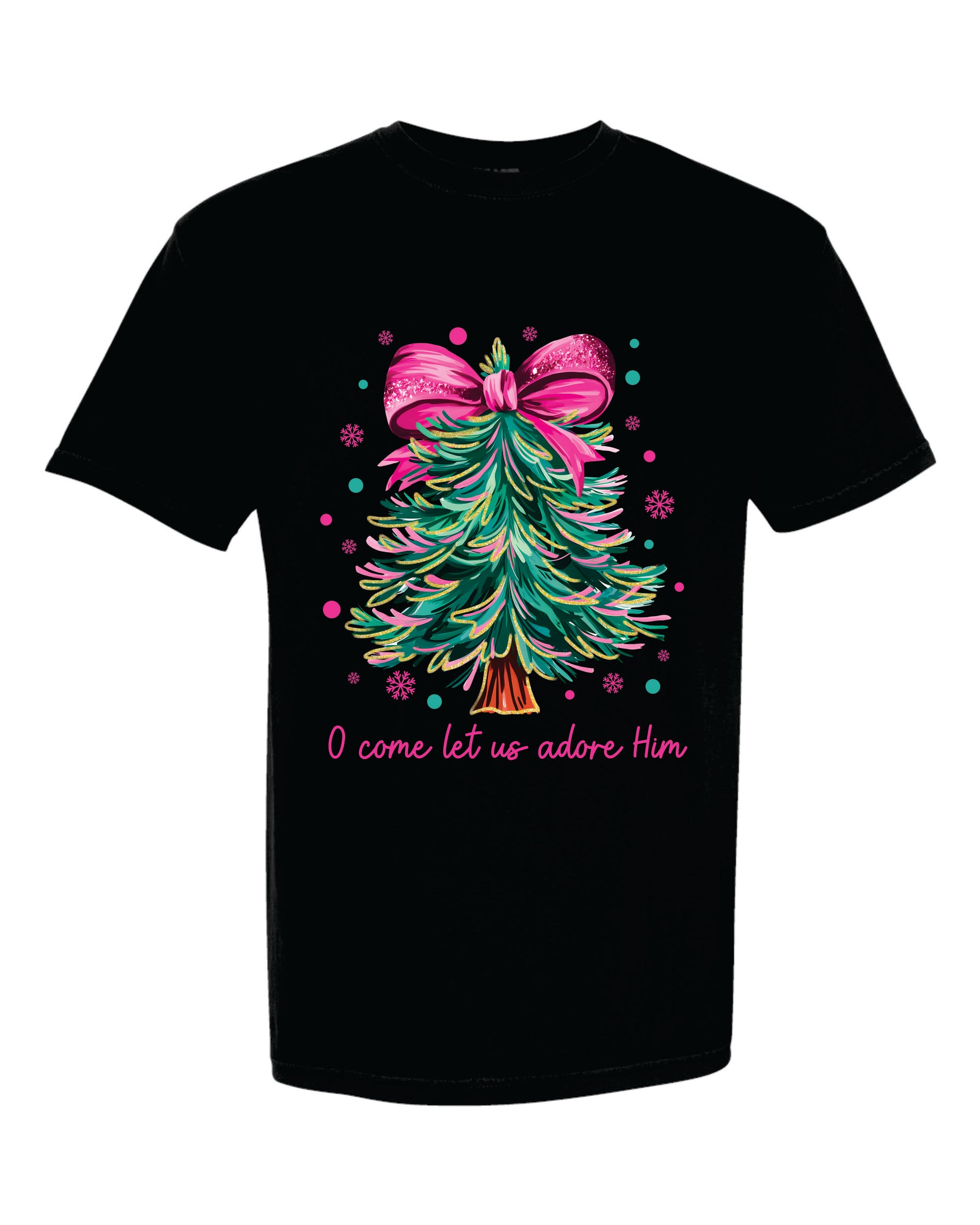 Featuring a glittery Christmas Tree design with the words "O Come Let Us Adore Him" on your choice of a short sleeve shirt, long sleeve shirt, or a sweatshirt!