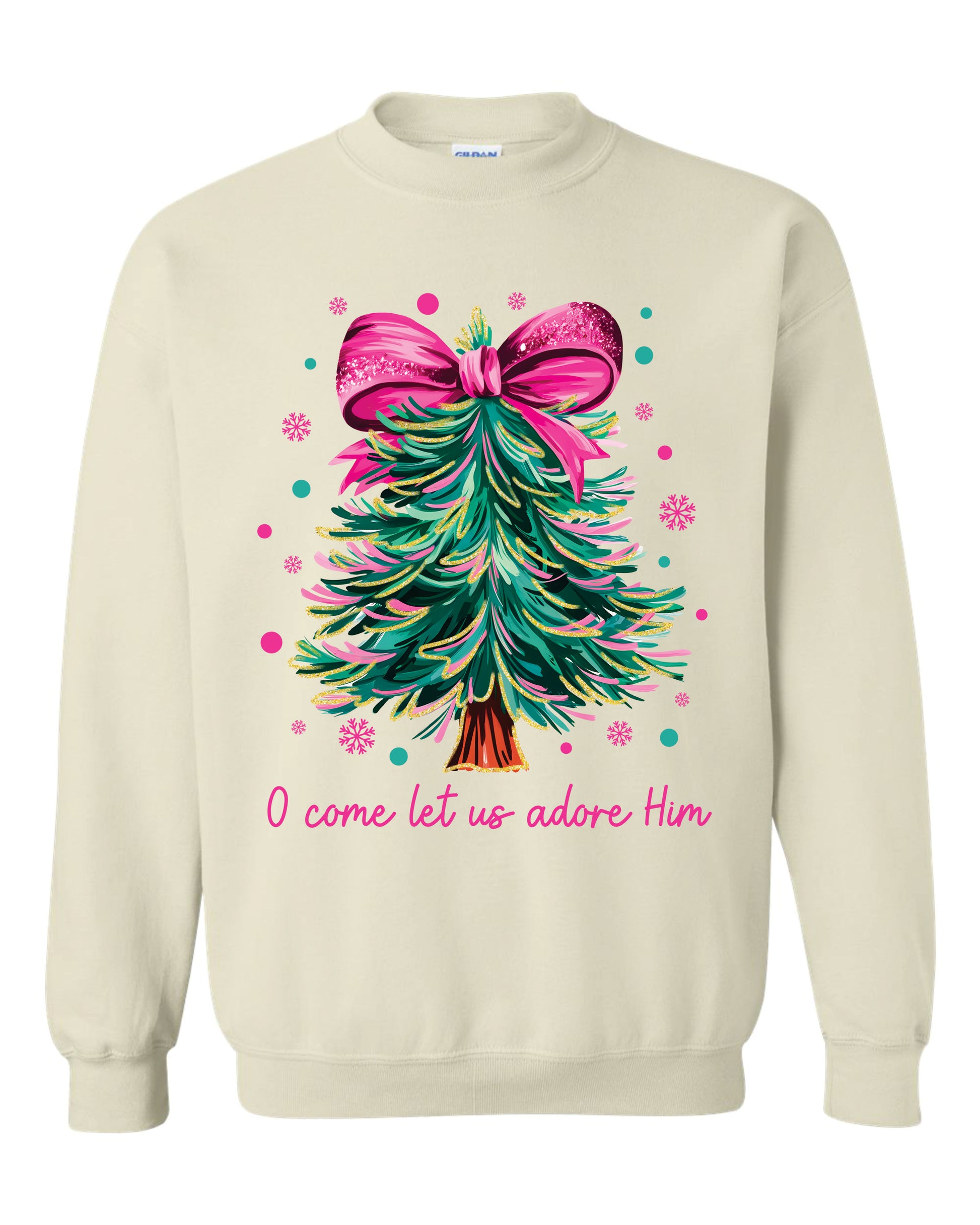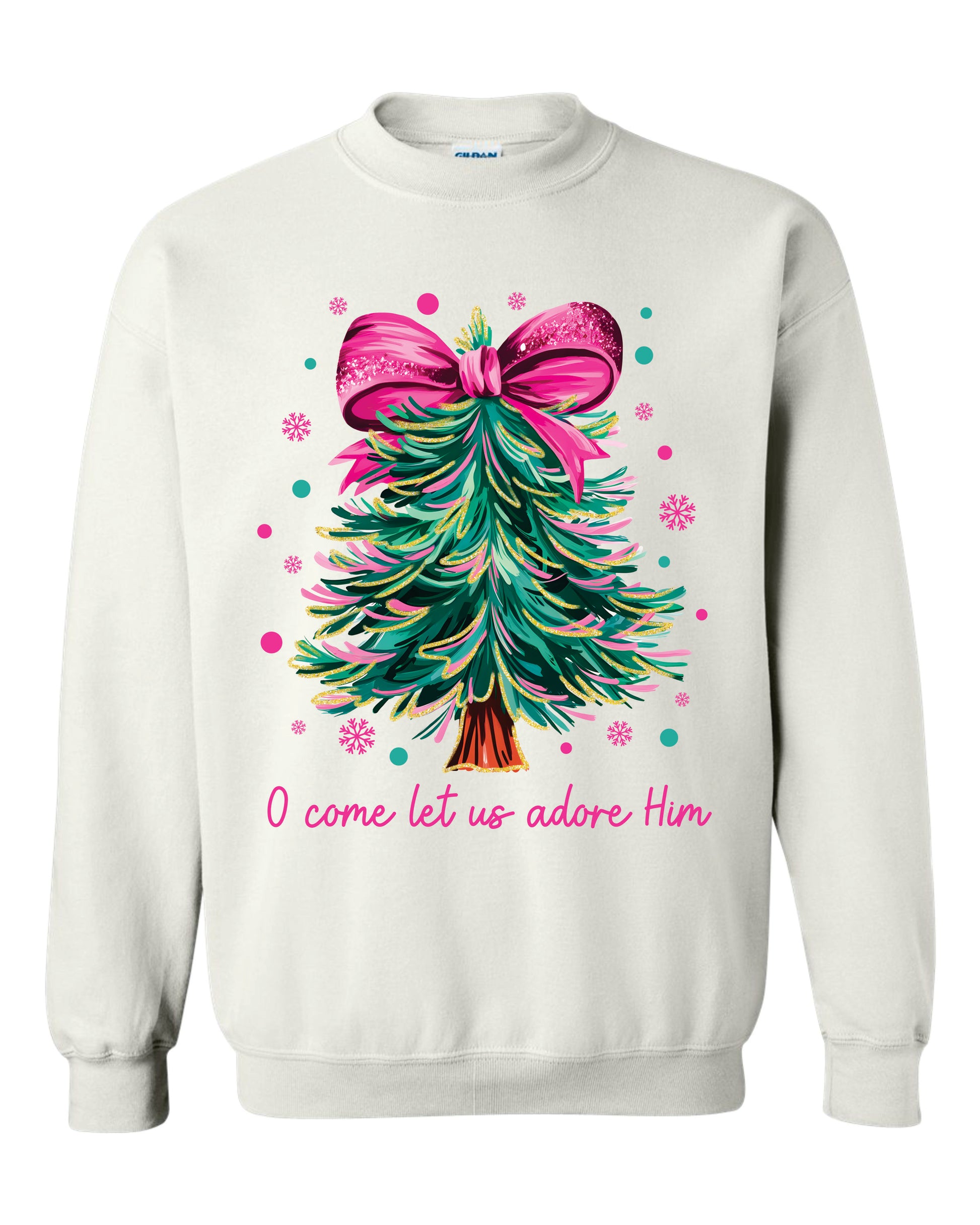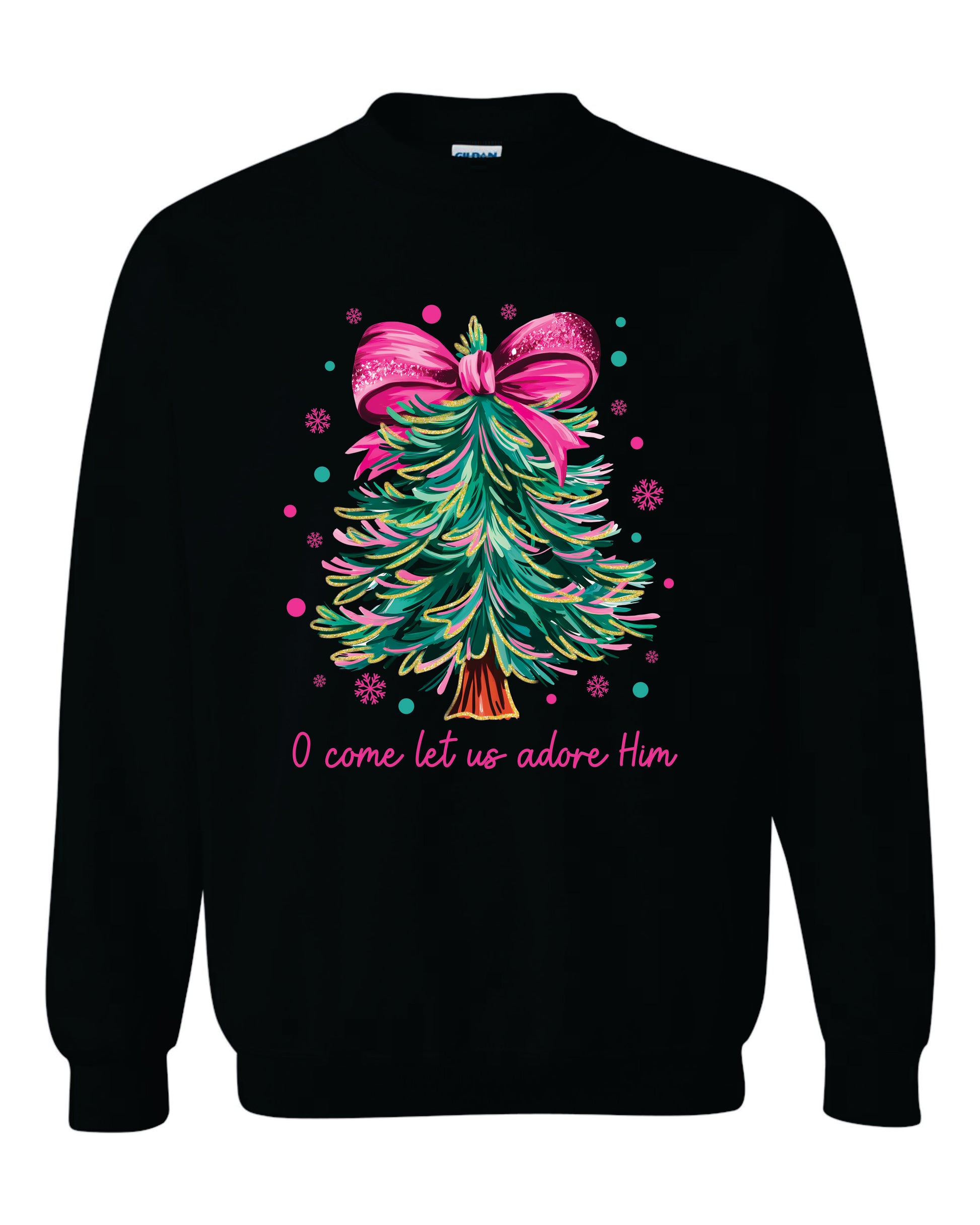 Featuring a glittery Christmas Tree design with the words "O Come Let Us Adore Him" on your choice of a short sleeve shirt, long sleeve shirt, or a sweatshirt!