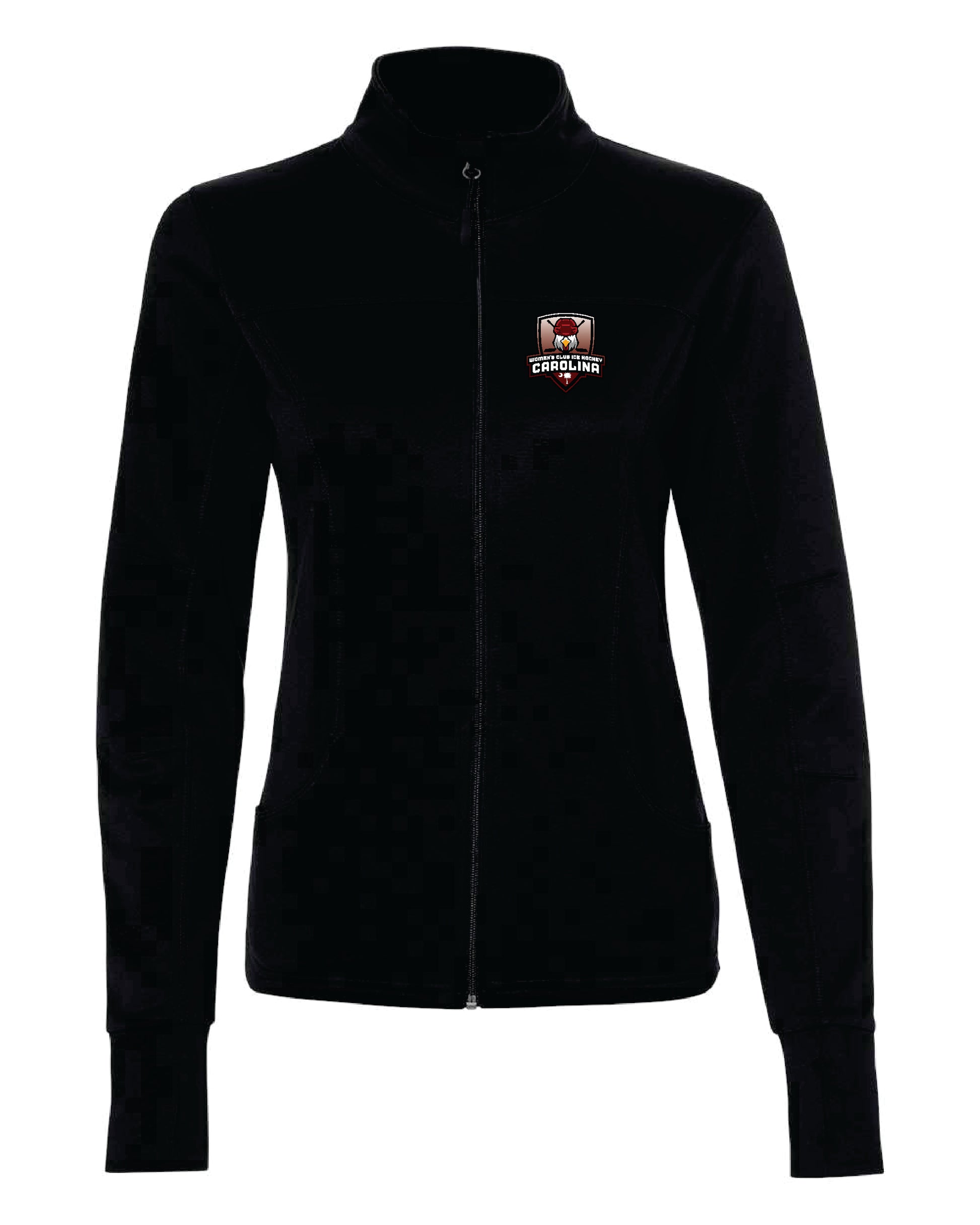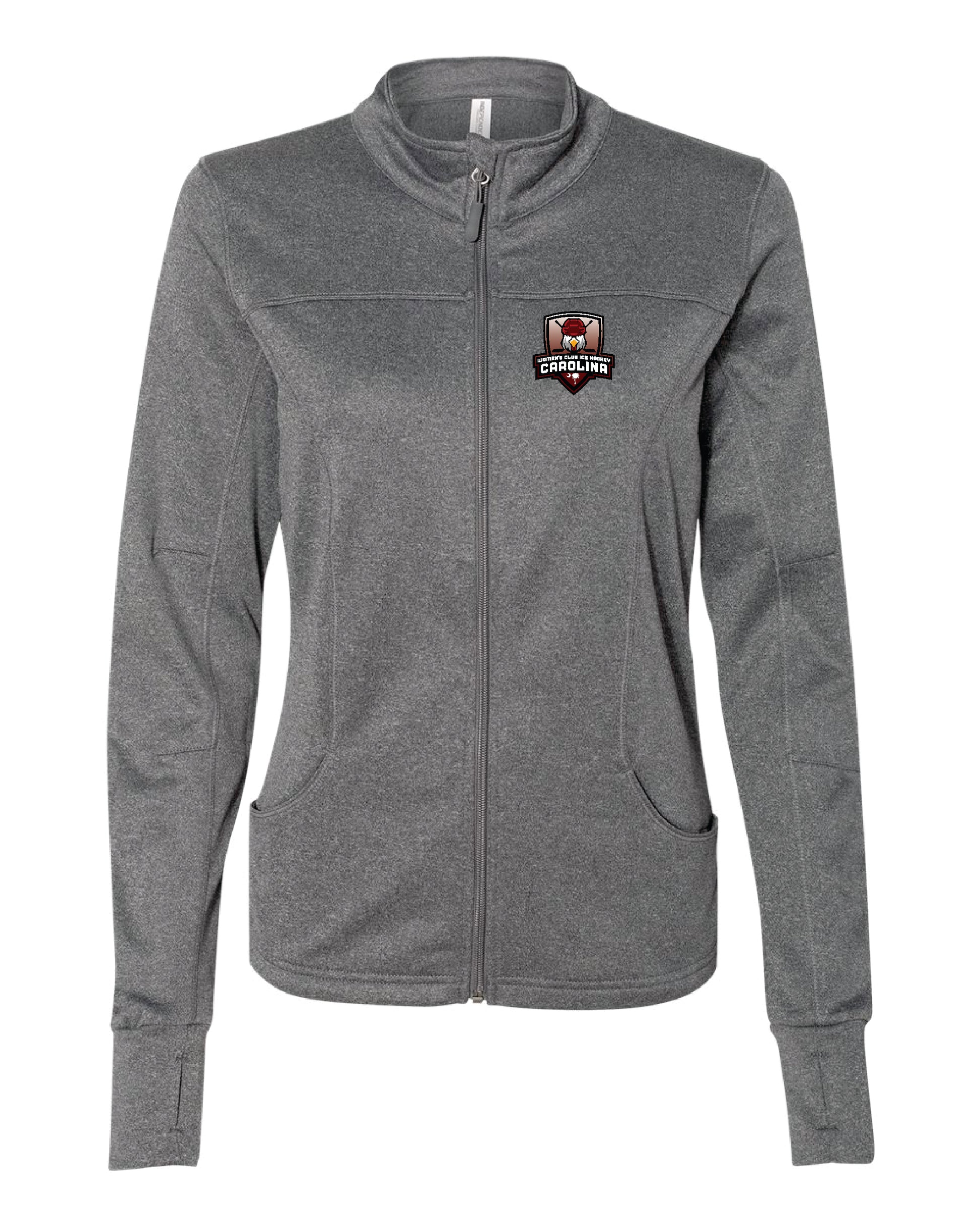 Featuring a women's track jacket with the crest or SC state logo heat pressed on the left chest! Available in black and heather grey.